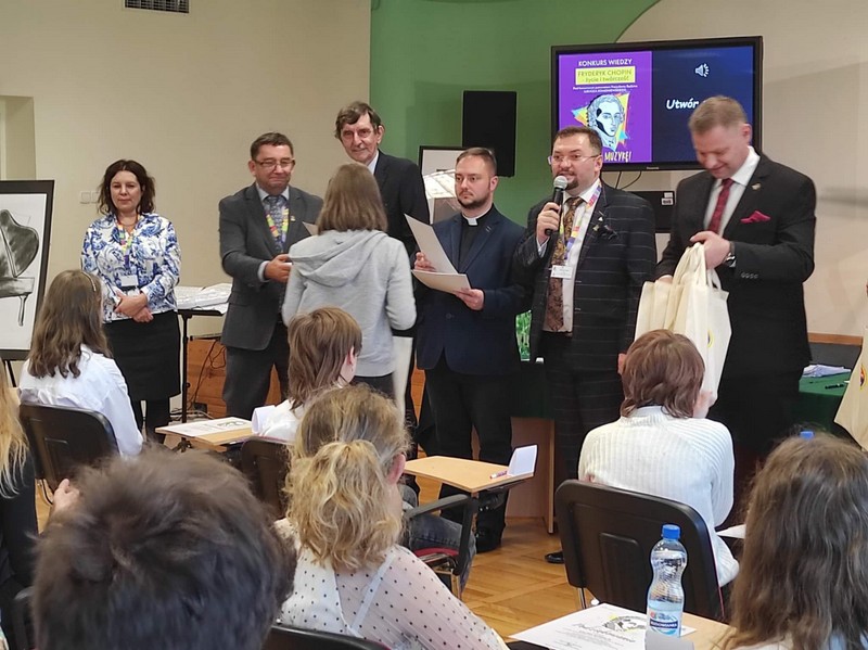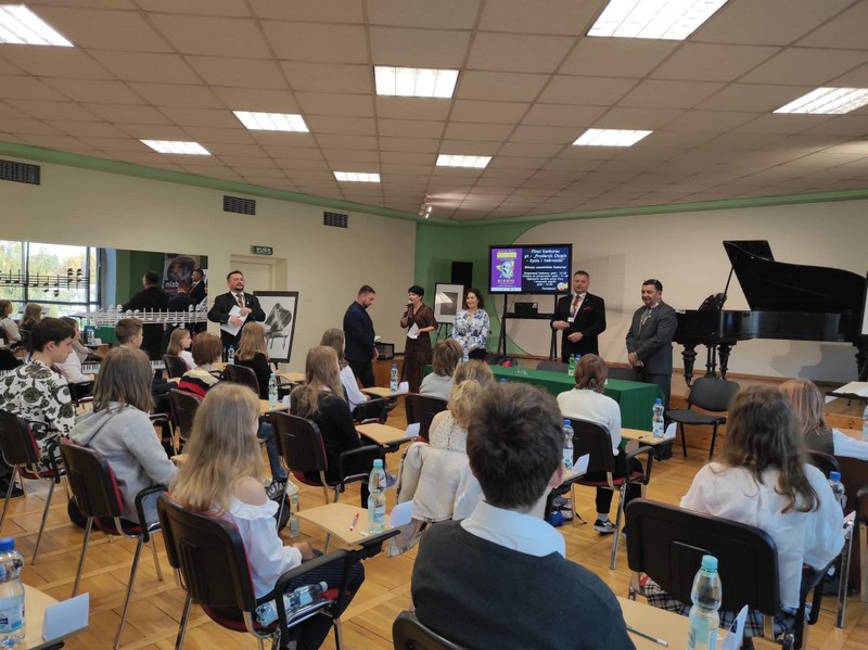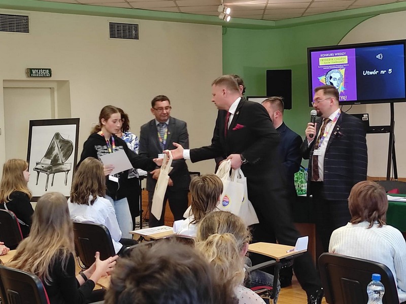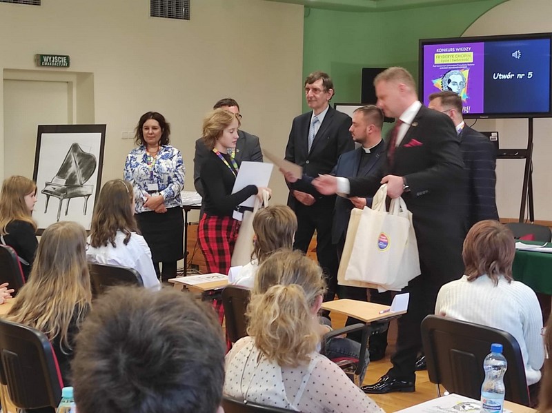 17 października w 173 rocznicę śmierci Fryderyka Chopina, uczennice z klasy 7: Maja Pikulska, Rozalia Makulska i z klasy 8: Maja Zając wzięły udział w miejskim konkursie muzycznym "Fryderyk Chopin - życie i twórczość”, pod honorowym patronatem Prezydenta Miasta Będzina Pana Łukasza Komoniewskiego, który odbył się w Miejskiej i Powiatowej Bibliotece Publicznej w Będzinie. Uczestnicy odpowiadali na bardzo trudne pytania dotyczące życia i twórczości F. Chopina oraz rozpoznawali ze słuchu konkretne utwory kompozytora. Dzięki temu poznali niezwykłe fakty i ciekawostki o tym wielkim kompozytorze, na przykład to, że ulubionym napojem Chopina była... gorąca czekolada. Gratulujemy naszym uczennicom zaangażowania i uczestnictwa w tak wspaniałym wydarzeniu.