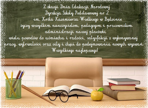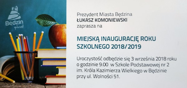 Z okazji rozpoczynającego się roku szkolnego 2018/2019 Dyrekcja Szkoły Podstawowej nr 2 w Będzinie życzy wszystkim uczniom, by zdobywanie wiedzy okazało się fascynującą podróżą, podczas której z radością odkrywa się, poznaje i rozumie prawa nauki i jej tajniki. Wierzymy, że szkoła stanie się dla Was miejscem, w którym będziecie rozwijać własne pasje i zainteresowania, poszerzać horyzonty oraz nawiązywać trwałe przyjaźnie.