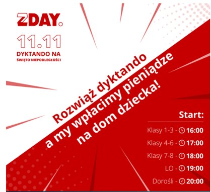 Szczegóły wydarzenia, w tym godziny rozpoczęcia dyktanda dla poszczególnych grup wiekowych, znajdują się na stronie: https://zday.pl/dyktando-charytatywne/