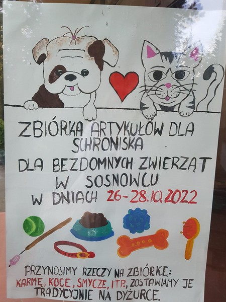 Jak co roku w naszej szkole zorganizowaliśmy zbiórkę na rzecz Schroniska dla Bezdomnych Zwierząt w Sosnowcu. Pod koniec października zostały wykonane plakaty informujące o zbliżającej się akcji, które pojawiły się na korytarzach szkoły. W zbiórce wzięli udział zarówno uczniowie klas młodszych jak i starszych. Zebraliśmy karmę dla psów i kotów oraz koce i zabawki. Szkoła otrzymała podziękowania od schroniska ale największą radość sprawiła nam możliwość pomocy potrzebującym zwierzętom. Wszystkim uczniom i rodzicom, którzy włączyli się do akcji serdecznie dziękujemy i zachęcamy do pomocy potrzebującym zwierzętom przez cały rok.