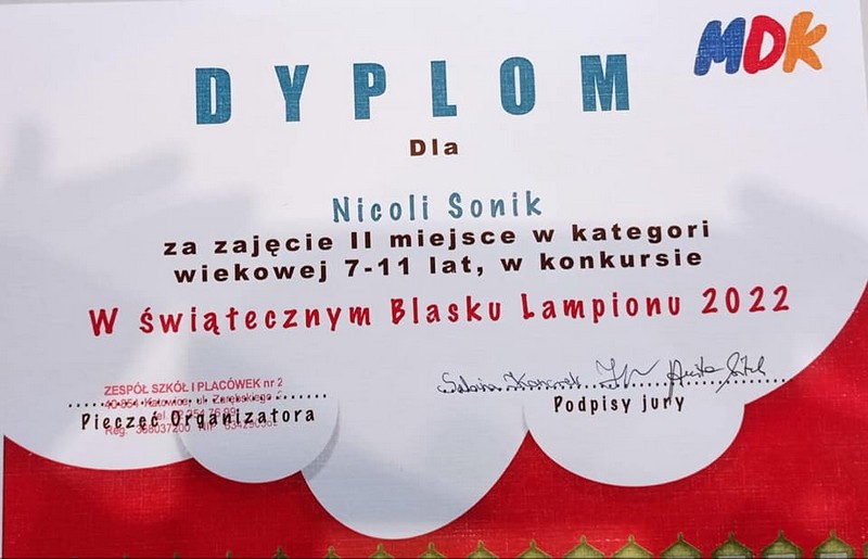 Uczennica klasy 4b Nicola Sonik zajęła II miejsce w konkursie ,,W świątecznym Blasku Lampionu 2022" w kategorii wiekowej 7-11 lat. Gratulujemy Nicoli.